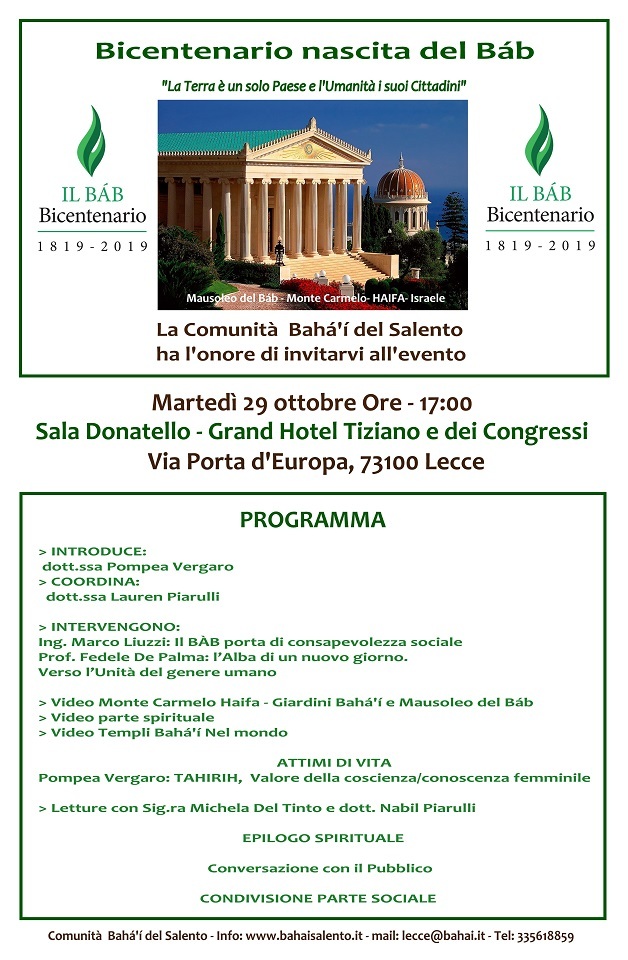 Anche a Lecce la Comunità Bahá’í celebra questo avvenimento martedì 29 ottobre alle ore 17:00 presso la sala Donatello dell’Hotel Tiziano dove sarà proposto un fitto programma: